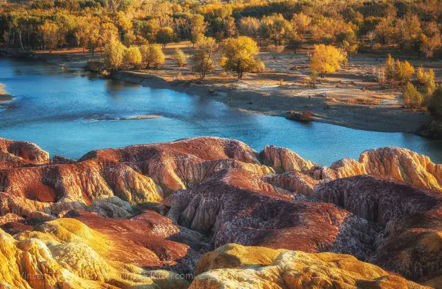 4.在额尔齐斯河边形成的五彩滩,蓝色的额尔齐斯河两岸风光各异,一边是金黄的胡杨,一边是棕色的彩丘。