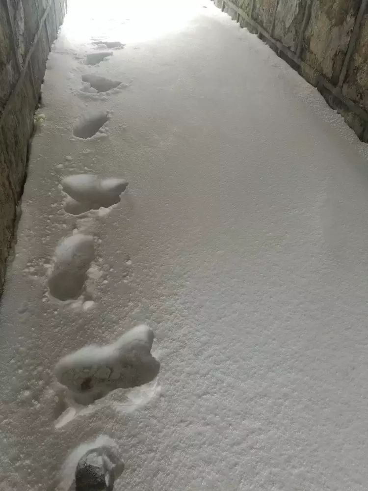 石堆之间积雪干净坚硬。