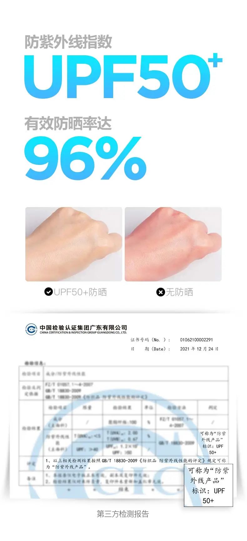 UPF>50代表紫外线阻隔率可以达到98%以上,适合户外活动时间较长的人~