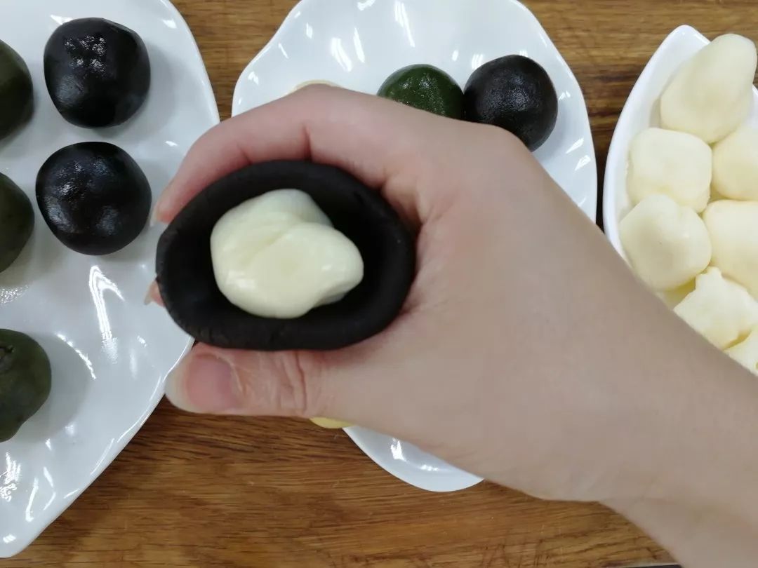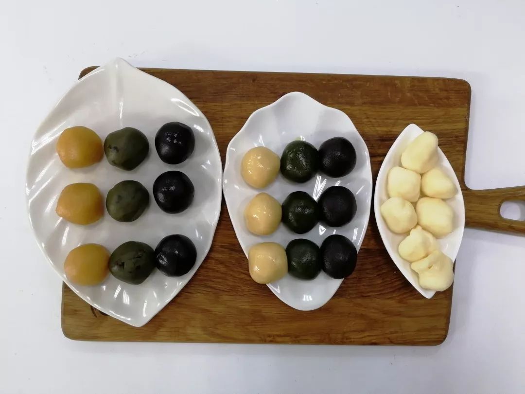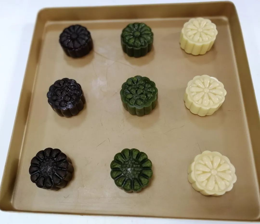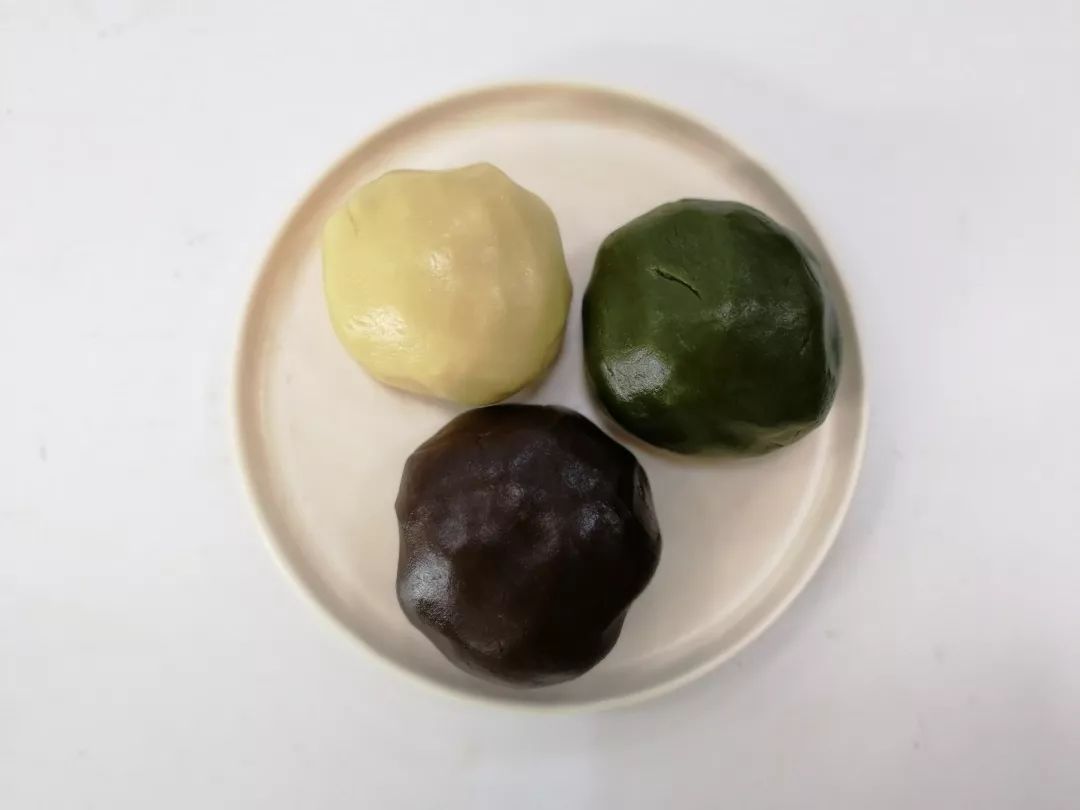 分别做好的三种口味月饼饼皮,覆盖保鲜膜静置30分钟左右;