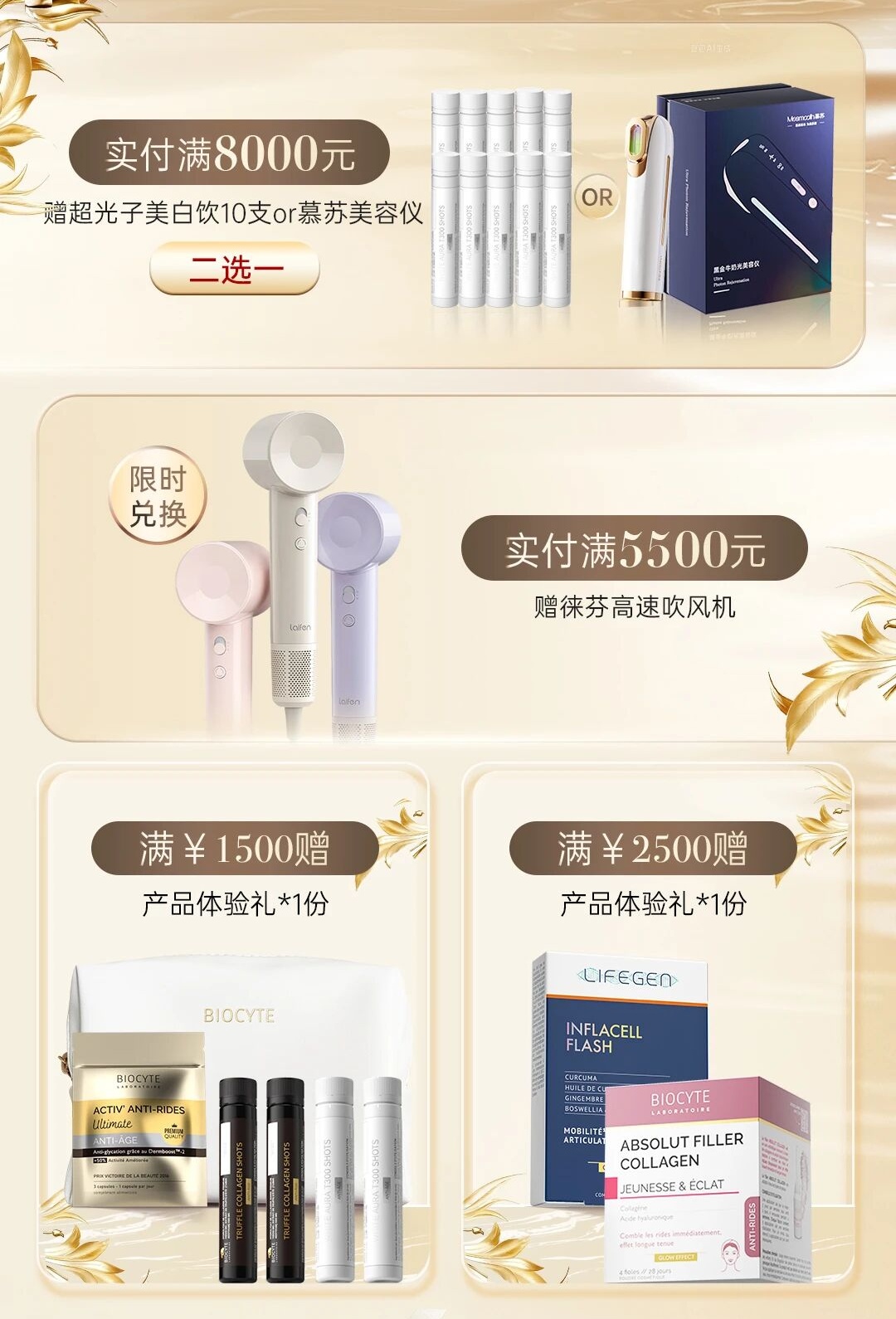 凡是购买美白饮、骨胶炮这三个产品的其中一个组合,即可享受低价换购福利