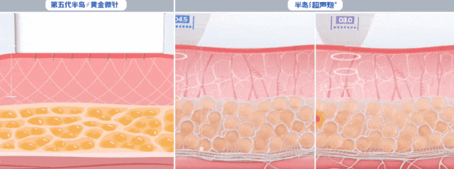 简单来说,半岛超声炮负责深层的全层提拉紧致,而真皮层的抗衰美肤,则需要第五代半岛黄金微针的补充治疗。