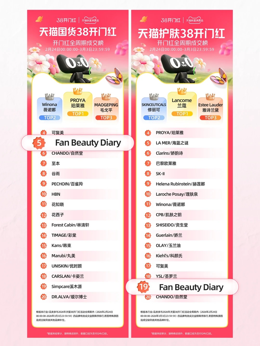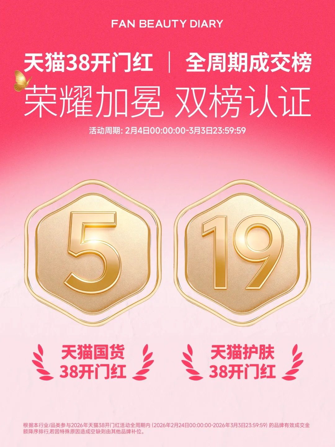 三月的风,捎来春日的暖意与节日的温柔,提前祝每一位了不起的你,妇女节快乐❤️!值此美好时刻,想与每一位BeautyFans分享一份属于我们的共同成绩单——在刚刚结束的「天猫38开门红」全周期成交榜中,Fan Beauty Diary荣登双榜佳绩:国货品牌Top5&护肤品牌Top19🏆。