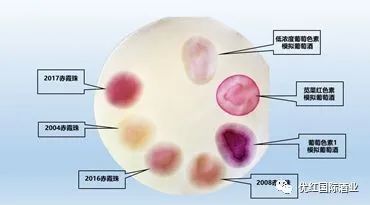 天然色素,通常不会是纯净的色素物质,往往会混有其他的植物材料,实际的颗粒较大,在纸巾上扩散会不均匀,越是年轻的葡萄酒这种显现越明显,如果是葡萄皮色素提取物更明显。