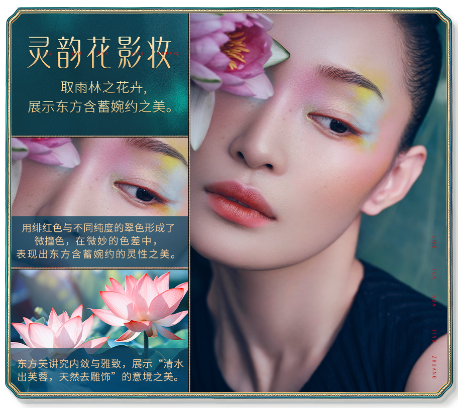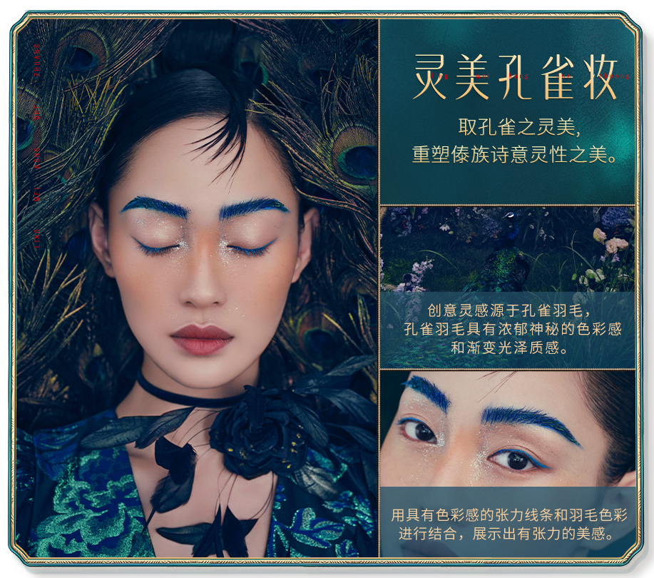 我们以傣族孔雀、花卉及傣妆为灵感,打造可以呈现东方自信气质、兼具国际时尚感的“中国妆”——灵美孔雀妆和灵韵花影妆。