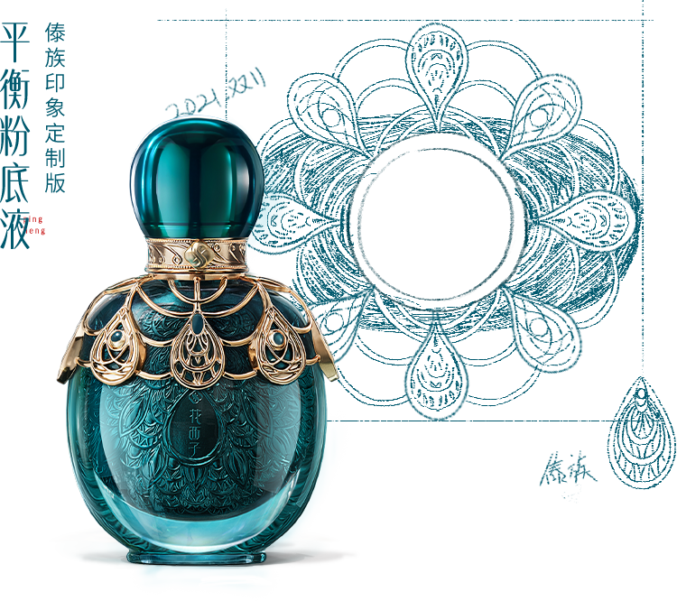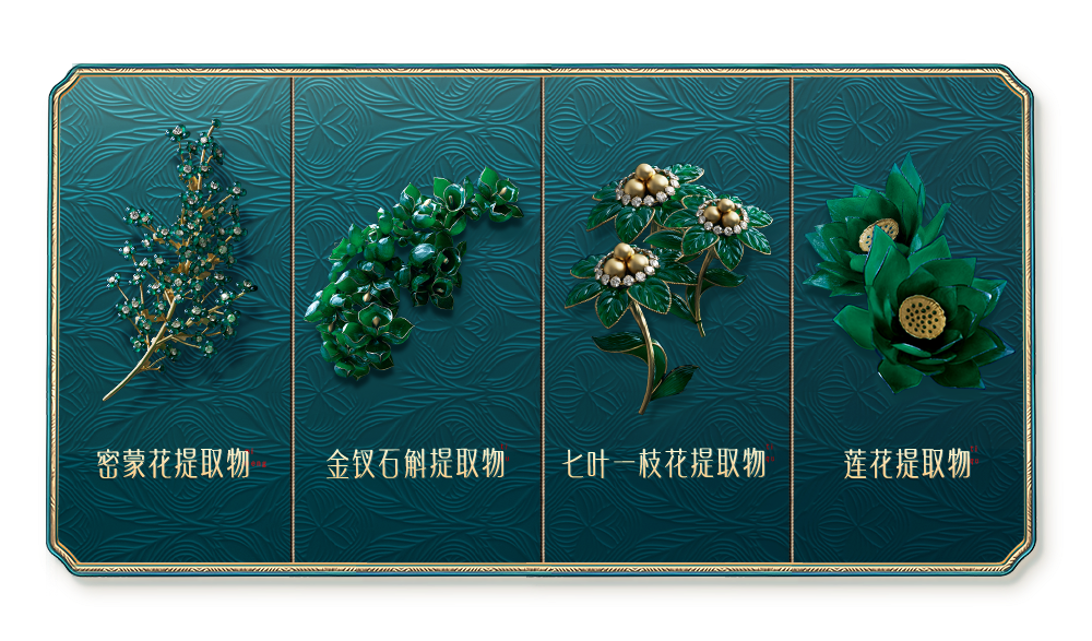 本次【傣族印象】系列产品的配方成分,我们便选取了傣族经典花植——密蒙花、金钗石斛、七叶一枝花、莲花,创新研发润泽抗氧的【四象活颜傣方™】,以花入妆。