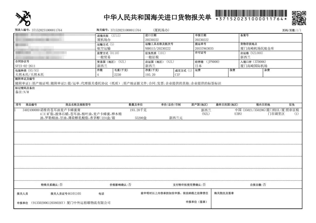 ▲Norvikon鼻炎膏进口报关单