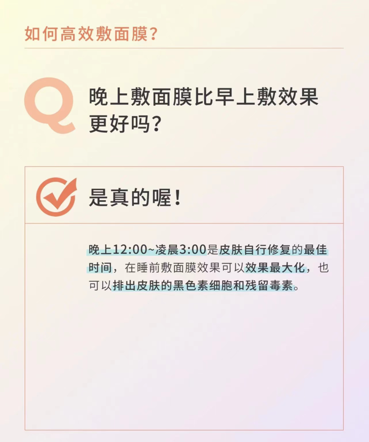 3️⃣晚上敷面膜遵循皮肤的代谢规律,效果更佳喔