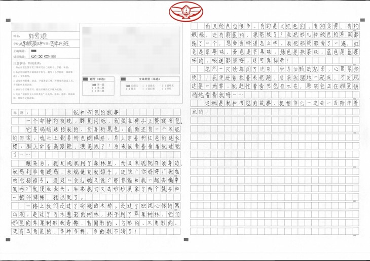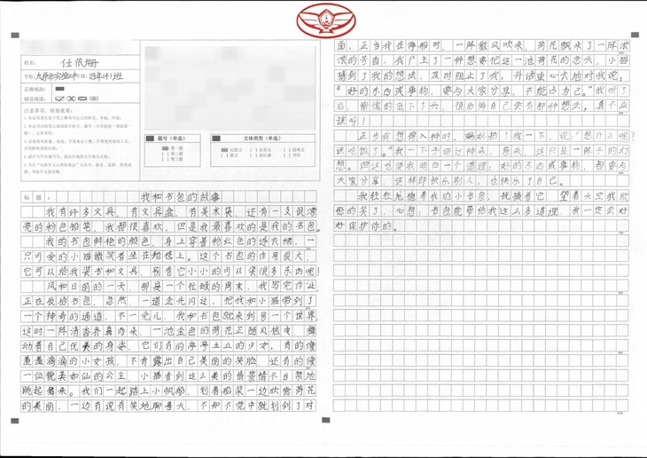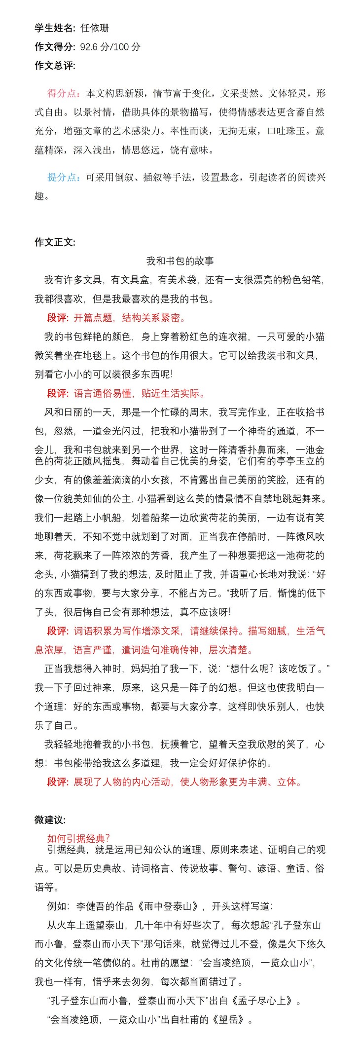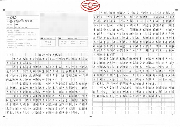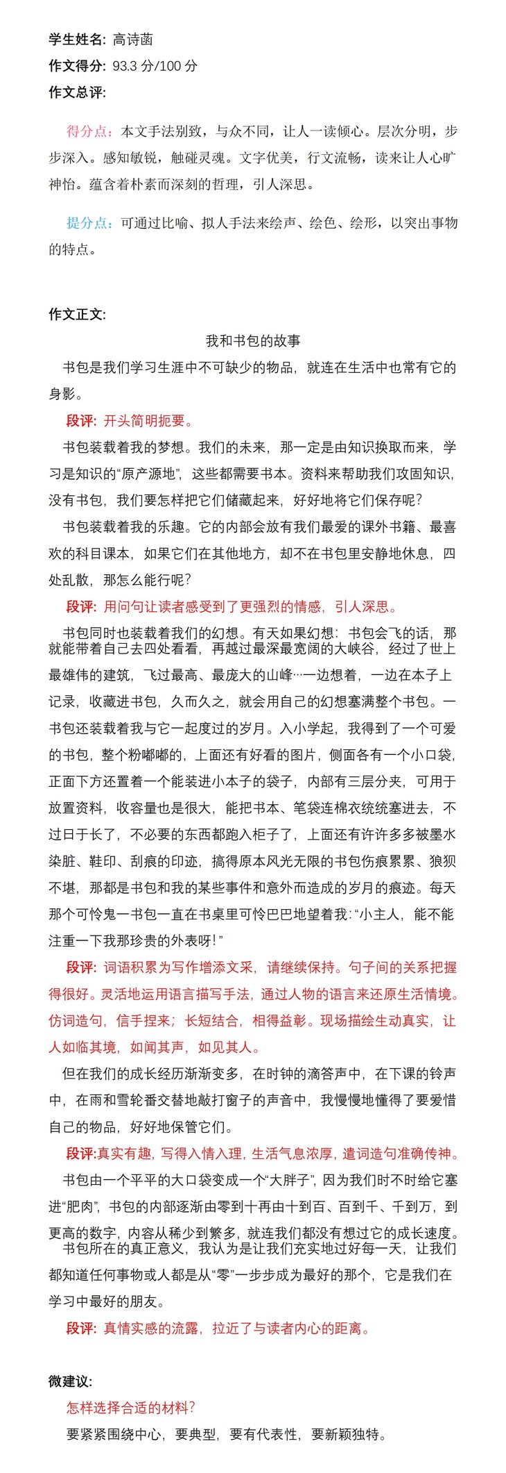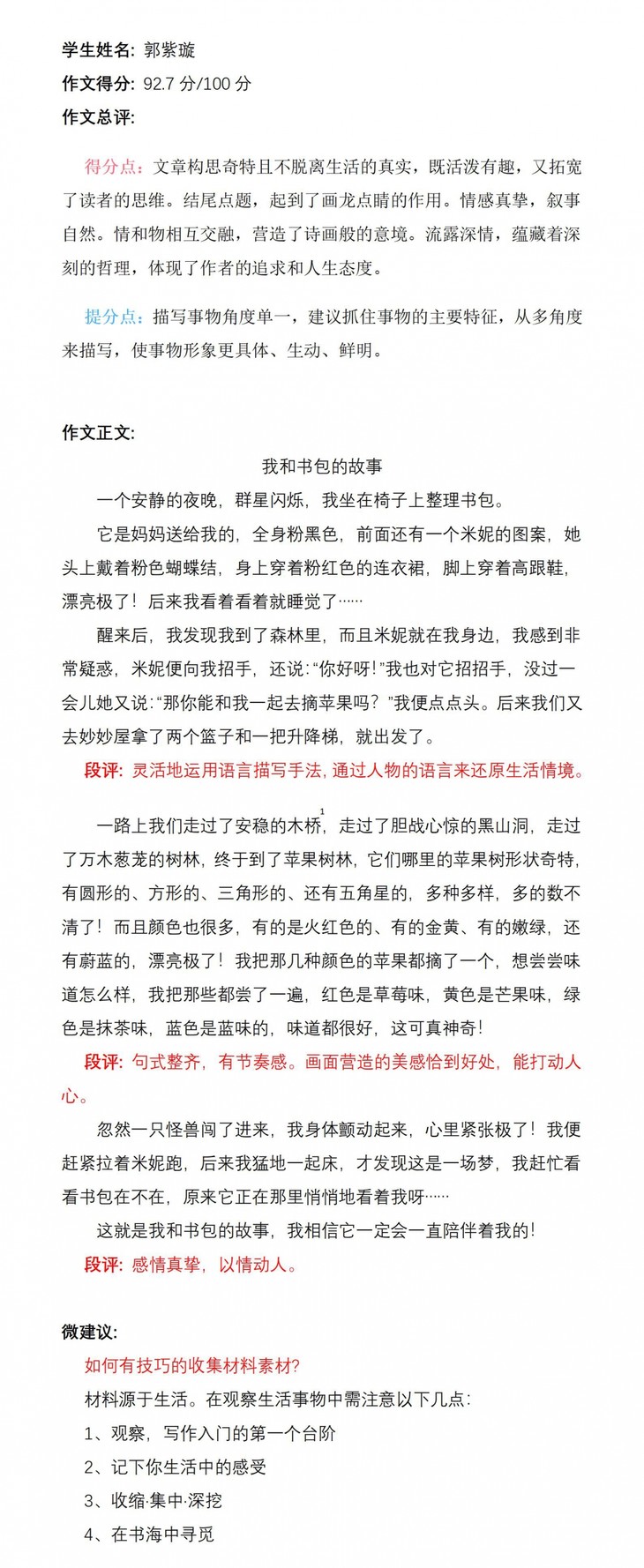 我一看到作文题目便思考起来,写了书包中蕴含了我的梦想、乐趣和幻想还有它陪我一起走过的岁月,从中引出书包对于我们的意义……半小时后我的草稿出炉啦,后又经过我的一番“整容”,加入对书包外形描写的段落,又精心加入啦拟人、排比等来装饰,就这样,《我和书包的故事》呈现在了我们眼前。