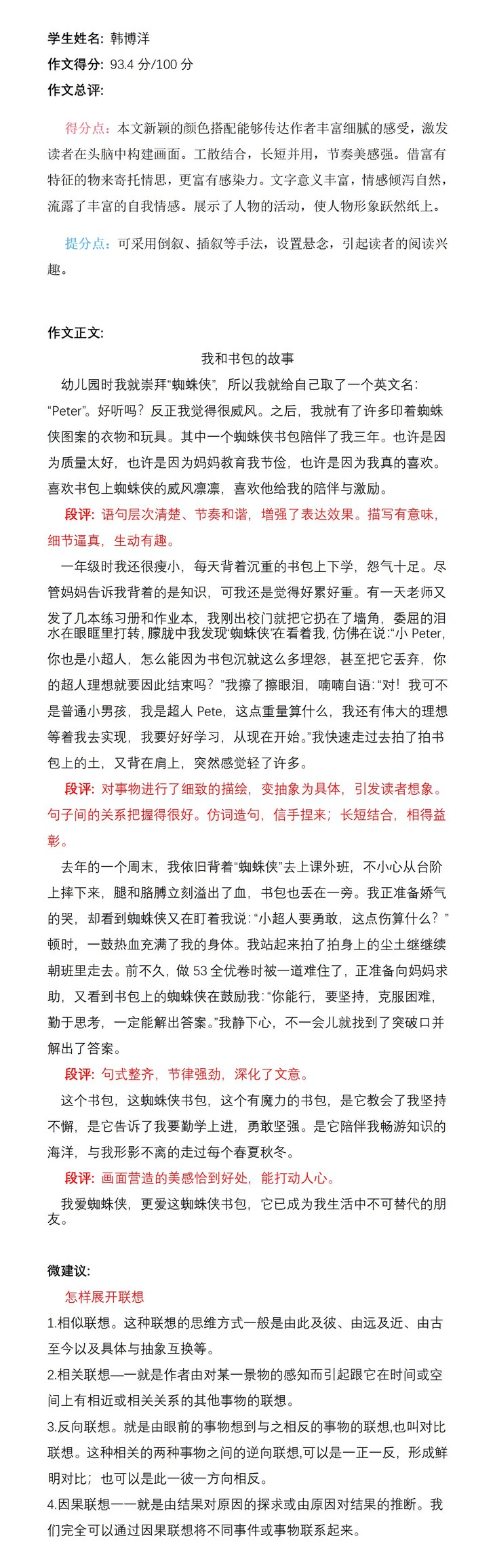 当我看到这个题目的时候,就会联想到与“书包”这两个字息息相关的信息。回想起,在我不同的年龄时段用过的不同书包,想起它们陪伴我成长的点点滴滴。能写出这篇作文,也是来源于平时多阅读的习惯,通过阅读使我增长了见识,积累了很多很多的好词好句,在写作过程中就可以运用到使文章增添不少色彩。所以,今后我要继续努力多读书,读好书。