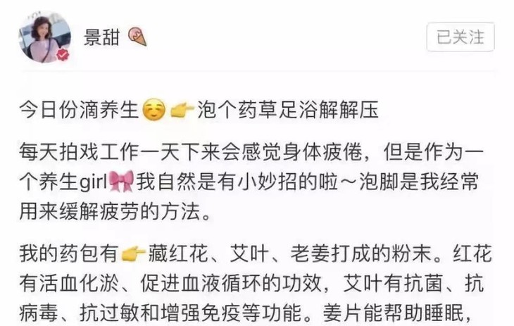 很多女星泡脚更是颇有一套理论,还贴心给粉丝们公开自己的中草药配方。
