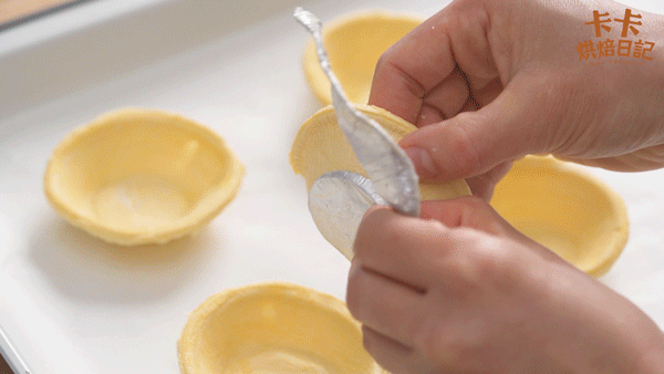 1.蛋挞皮从冰箱拿出后直接脱壳,摆在放有炉纸的烤盘上,室温下放软压平