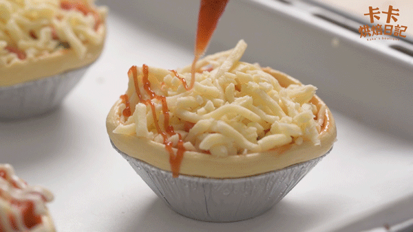 依次放上10g马苏里拉芝士碎、20g蔬菜丁、10g火腿丁、再撒上一层芝士碎,最后挤上番茄酱和沙拉酱,撒上黑胡椒即可