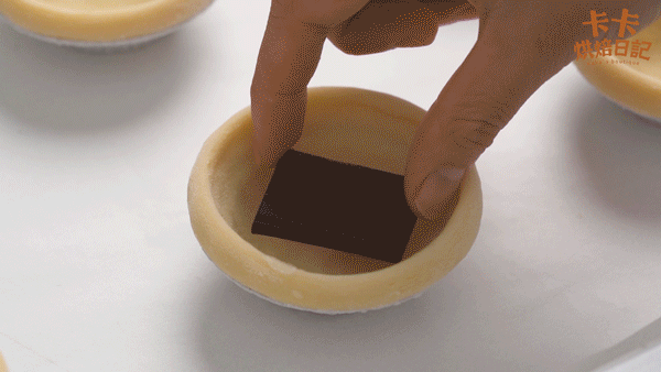2.取6个蛋挞皮,每个放入5g黑巧,倒入蛋挞液至9分满