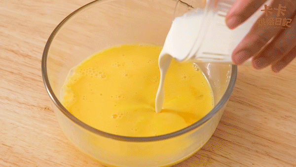 另取一个容器把蛋黄和全蛋搅散后,加入牛奶液搅拌均匀过筛备用