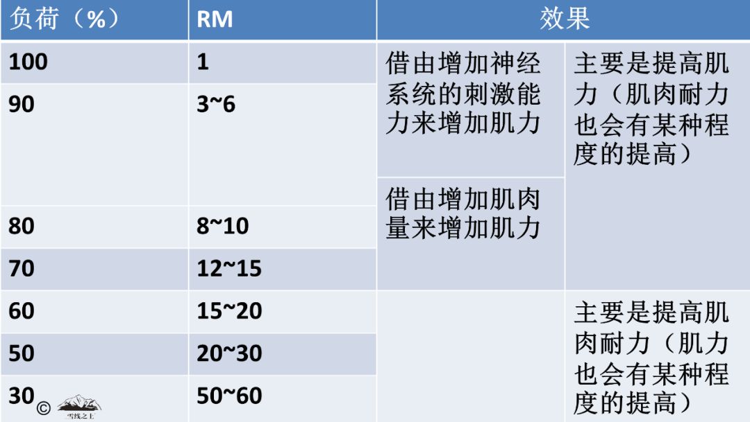 肌力训练时,负荷、最高反复次数(RM)以及所产生效果之间的关系。