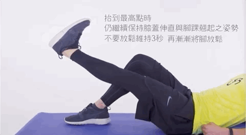 也可仰躺,膝盖伸直,脚踝不动,单腿慢慢抬起,维持数秒、20~30次为一组,最少进行3组。