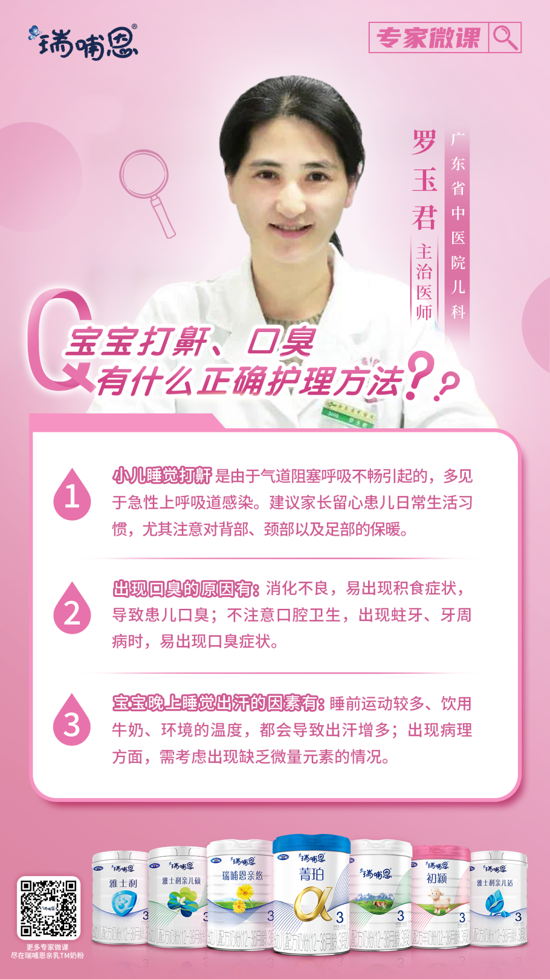 本期专家微课,由广东省中医院儿科主治医师——罗玉君给妈妈科普宝宝口臭、打鼾等的专业知识。赶紧收藏起来,从容应对宝宝口臭、打鼾等问题!