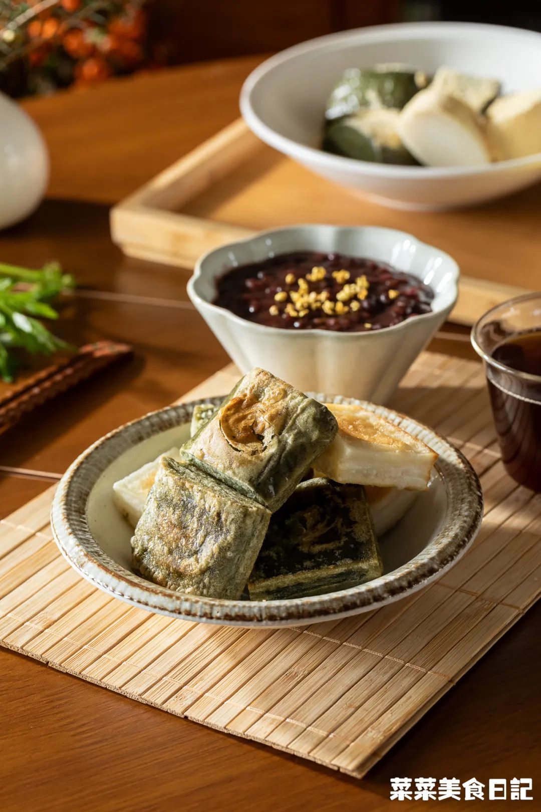 做法:年糕切片,起锅热油倒入比日常炒菜多的食用油,中小火煎至两面金黄,大约3~4分钟。煎好的年糕外脆里糯,鼓鼓的超级可爱,直接吃就香到直跺脚。再配上这一碗红豆沙,细腻甜蜜的豆沙加上酥脆治愈的年糕,一碗落肚,全身暖粒粒,心满意足。除了直接香煎,你们还可以裹上其它食材调味,比如我之前做过葱油塌年糕。做法:年糕煎炸至两面金黄,倒出多余油,然后撒上多多的葱花,加点盐、胡椒粉调味,中火翻炒1-2分钟入味出锅。小葱撒得又多又密,趁热咬下,酥和软两级分明。