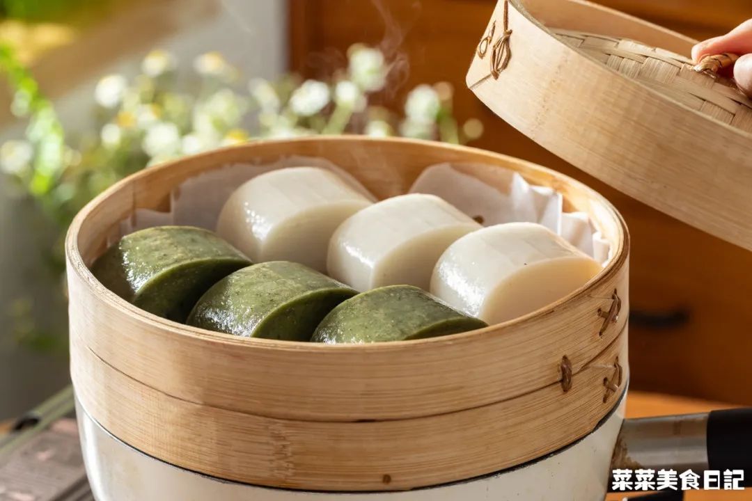 年糕最简单的吃法,切厚片,放入上汽蒸锅蒸约12分钟。年糕就这样在咕嘟咕嘟的声音里慢慢软下来,蒸好的年糕呈现清新的艾草绿,表面光滑透亮,仿佛一块碧玉。