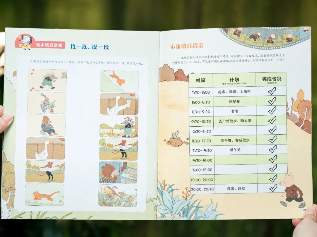 “小猪的日程表”,通过帮助故事主角小猪安排一天的行程,让娃懂得合理规划时间,好好度过每一天。