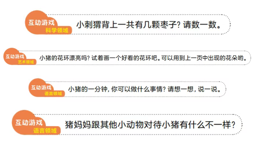 绘本故事里穿插健康、语言、社会、科学、艺术五大领域的互动小游戏。