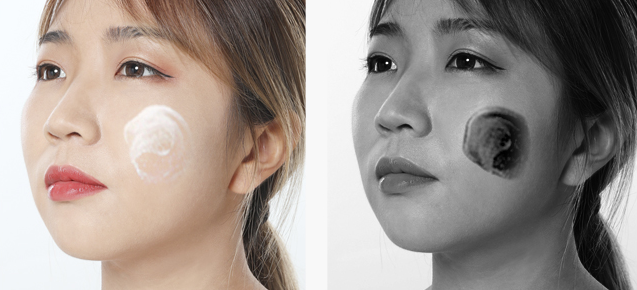 在紫外线镜头下,涂上DrDeep缔怡的地方肌肤呈深黑色。