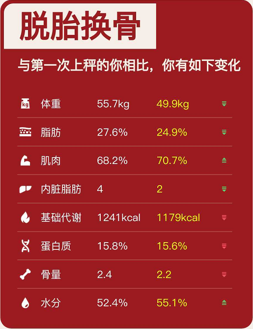 ——肌肉含量增加2%,体重从55.7kg到49.9kg,减轻了整整十斤。
