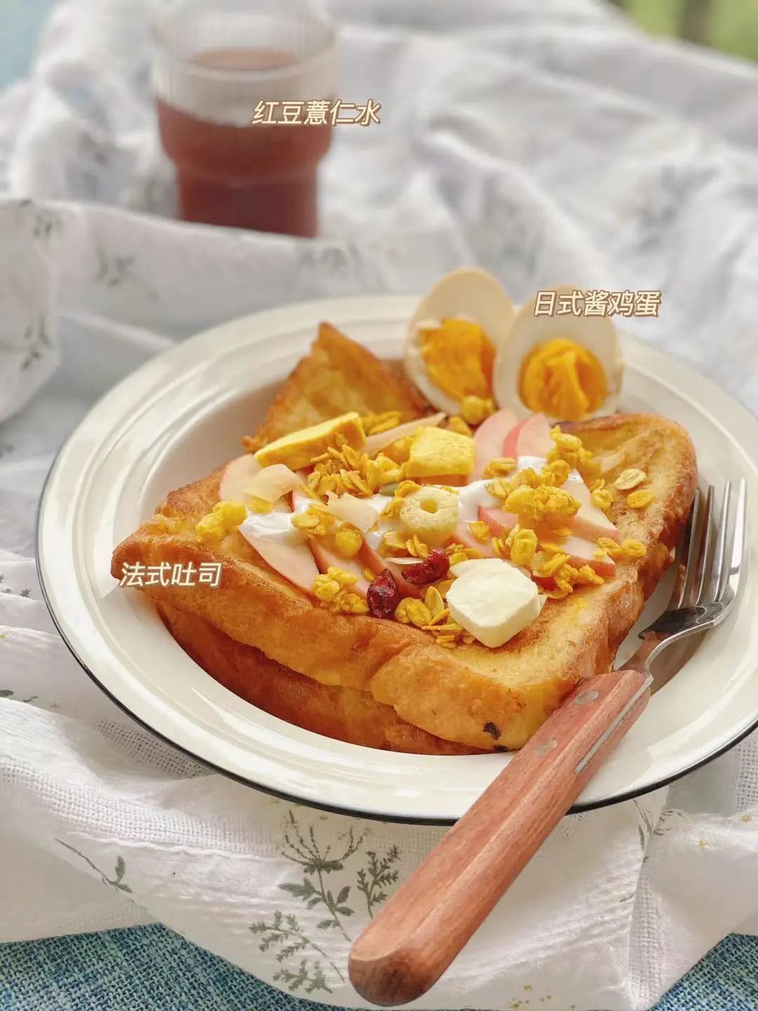 两片吐司,150毫升牛奶加一个鸡蛋液,加一点糖,吐司浸泡一晚上,第二天起来用黄油煎一下或者烤一下到有点焦黄的程度,倒上酸奶,放上喜欢的水果就完成了。