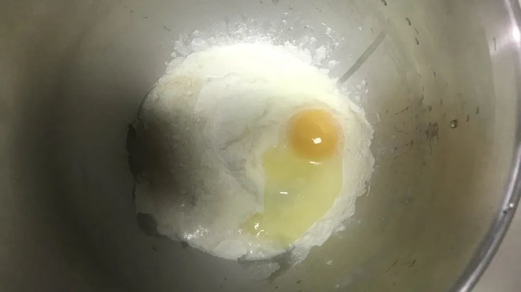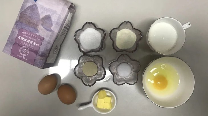 将除黄油,卤蛋外的所有原材料依次倒入打面缸中,先开低速搅匀,再高速打至拉粗膜