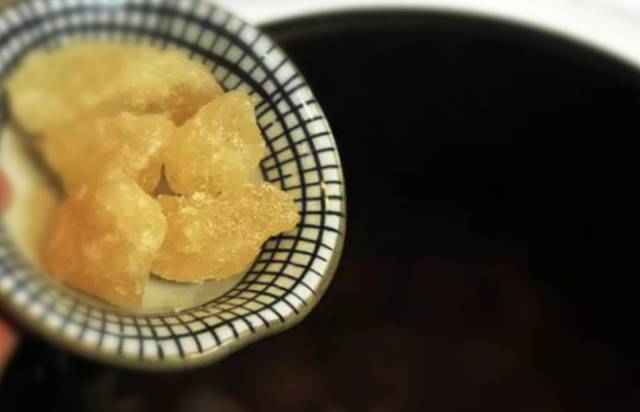 1、1勺油入锅,放入4-5块冰糖(20克左右),小火让其融化;