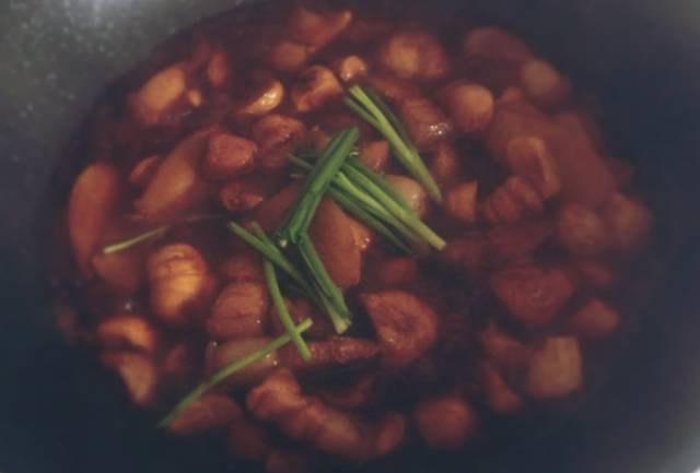 4、放入板栗,再大火炖煮15分钟,汤汁收浓,调盐,撒上葱花就能出锅了!