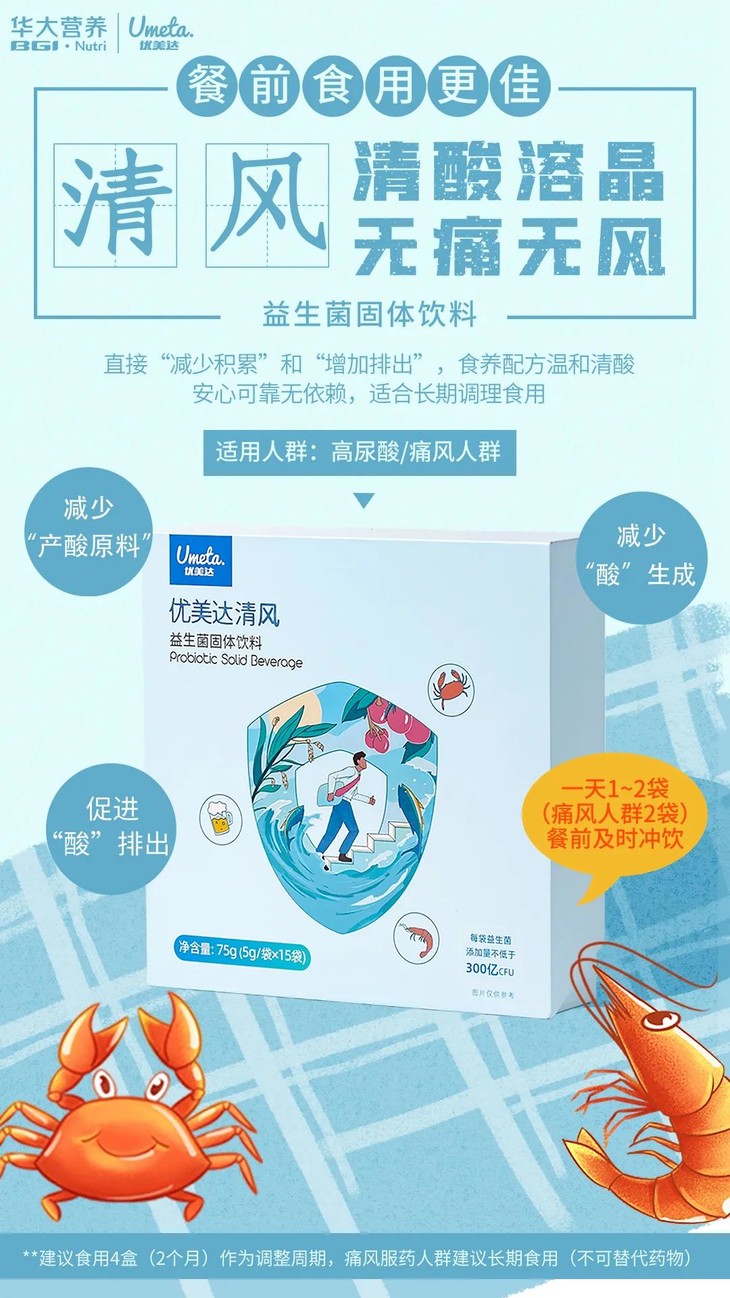 (注意:优美达清风属于益生菌食品,不可替代药物治疗,请理性消费,清风日常可与治疗高尿酸的药物同食。)