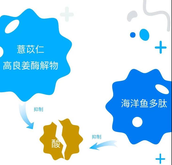黄嘌呤氧化酶是尿酸升高的关键酶,实验证实,薏苡仁高良姜酶解物、海洋鱼多肽可抑制黄嘌呤氧化酶的活性,从而抑制多余酸值升高。