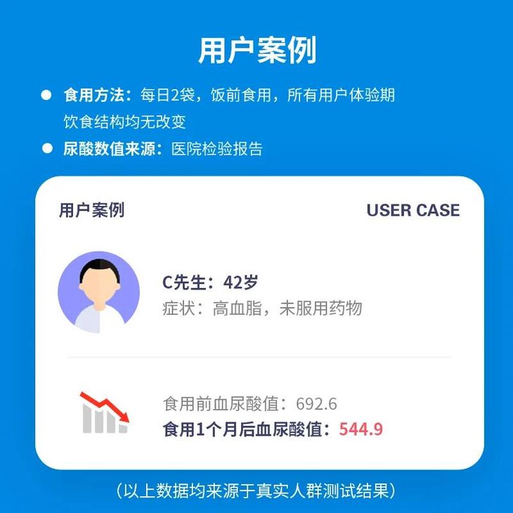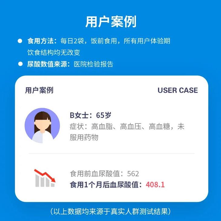 清风益生菌配方经过长久打磨,从“减少原料”、“抑制生成”、“促进多余酸排出”三个食养清酸的方向精心选料,并邀请十数位高尿酸/痛风用户参加为期一个月的清酸体验(体验期建议食用量为2袋/日),体验前后分别提供由正规医院检验的血尿酸数值。