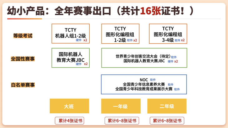 像是大班到二年级,只要报课,一年的时间,就能拿到起码4张证书,三年上完,最多能Get18张证书