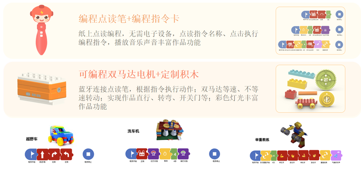 只将编程指令卡排布好,用点读笔一个个点过去,相应的指令就会通过蓝牙传递给马达,让机器人按照编程指令执行