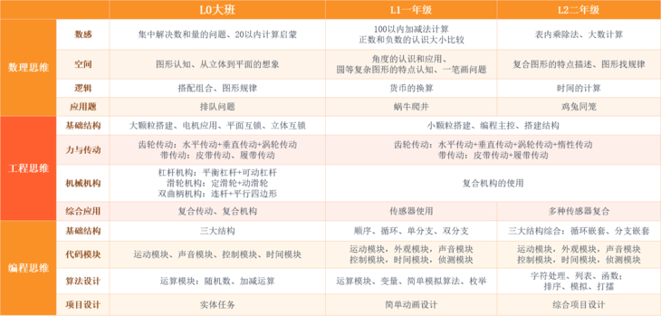 整个L0~L2阶段,还会进行思维的提升,毕竟是原学而思培优团队老师设计的课程,基本每节课都会有数学思维、工程思维、编程思维三块知识