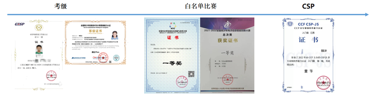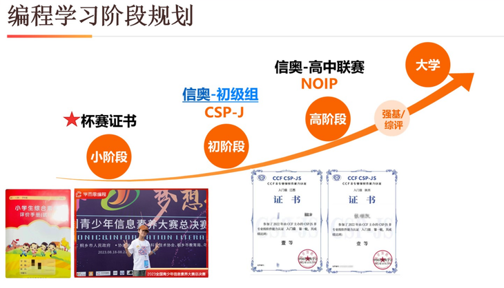 也就是说,跟着学而思编程的体系走,小学阶段获得白名单的杯赛证书,初中阶段拿下信奥初级组认证,高中阶段直接冲击信奥奖牌,助力强基计划,进好大学!