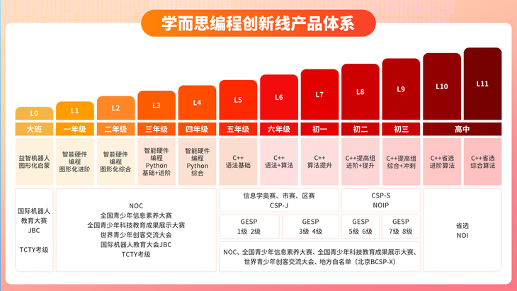 只要孩子报了学而思编程,无论是大班还是六年级,都有对应的赛考机会,服务、课程也都会跟上