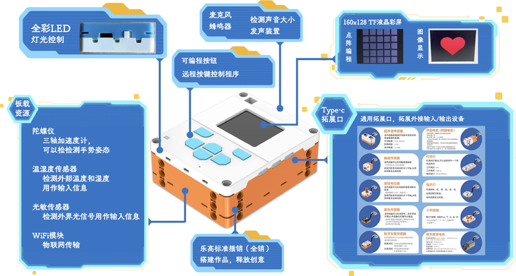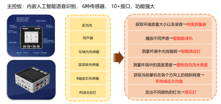 要实现这么多丰富的功能,学而思编程Python课程的主控板是关键,种种配件就强调了两个字:“智能”