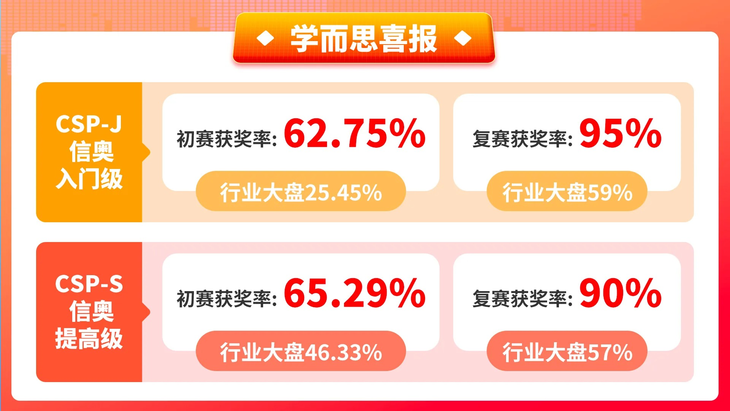 像是信奥资格认定的CSP考试,初赛获奖率62.7%,比行业大盘高了一倍都不止