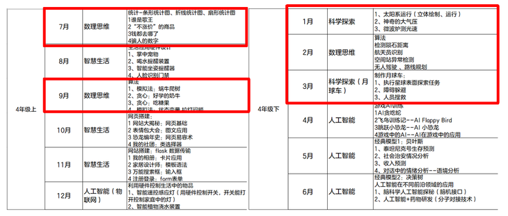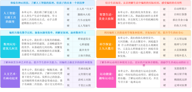 我们来看看整个学而思编程的课程体系,从大班一直到四年级,都有丰富的知识加码,数理、科学、人文艺术和未来的智慧生活,符合新课标要求,提升孩子的综合能力