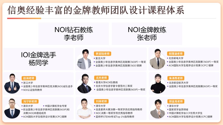 图片中只有称呼没有照片的老师,都是各名校的招牌信奥指导老师,不敢随随便便露脸的那种,其他展示的老师也都是985学历+竞赛选手,有学历、有经验的优秀信奥老师