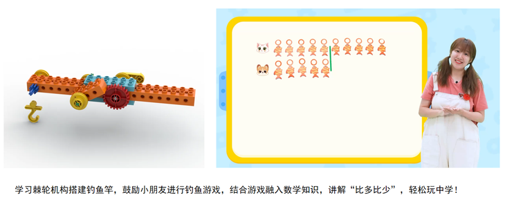 每节课都会结合故事,让孩子学会新的数学思维知识,比如制作钓鱼竿的课程,就会用钓鱼游戏进行多与少的比较