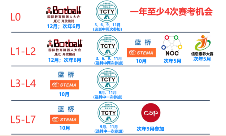 L5~L6,9月参加TCTY,10月参加蓝桥STEMA竞赛,次年9月有机会参加CSP,这可是信奥资格认定赛!!规格超高!!