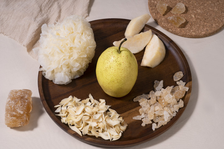 ①银耳提前泡发,百合洗净备用,雪梨洗净去皮,再将其果肉去芯切块;