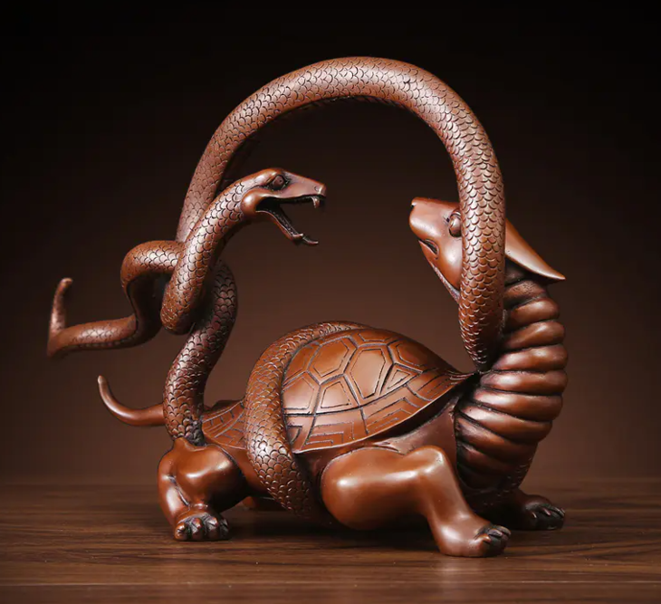 玄武位居住宅后方和北方,亦是“靠山”,后方易高,成环抱状称之为吉;代表有靠山,物资充沛,无后顾之忧。在合适的位置放玄武摆件,有镇宅、保健康、护平安、旺财气,增强安全感,提升人际关系的寓意。