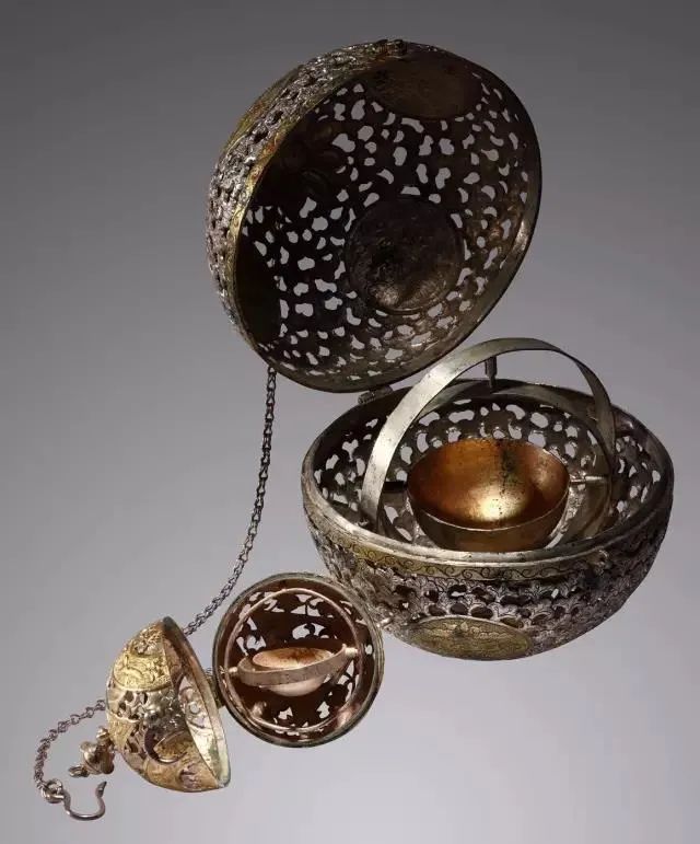 唐墓中出土了很多“被中香炉”,分为内外三层,最外层为镂空球形,中层连接外壁和内层的焚香盂,这样就可以使得焚香盂中的香丸和燃炭始终保持水平,不会洒漏。