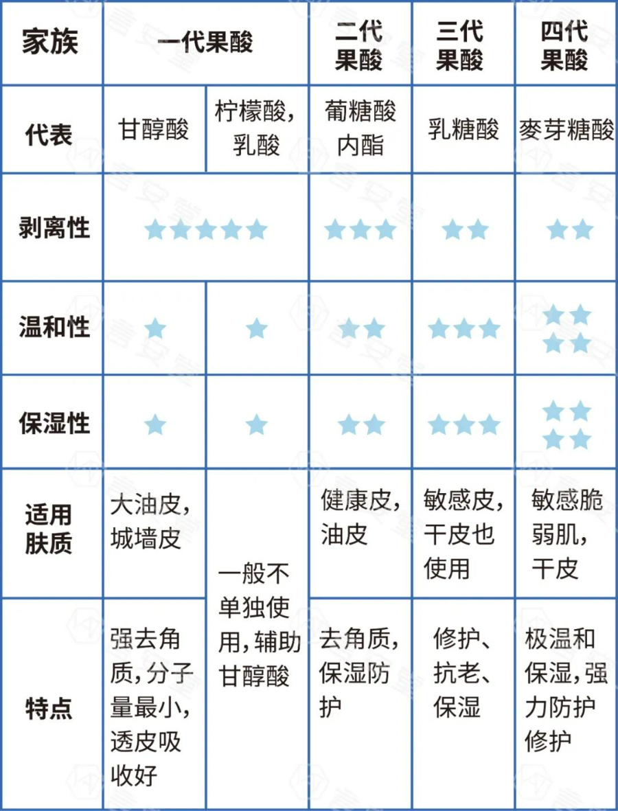 -α-羟基酸:是水溶性的酸,包括各种果酸,常见的有:甘醇酸,柠檬酸,苹果酸,乳酸等等,果酸通常分子量较小,最易渗透角质层,达到剥脱的作用。